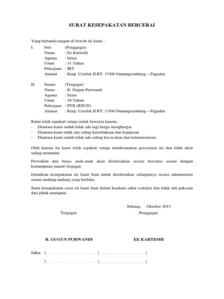 Contoh surat pernyataan kesepakatan perceraian.